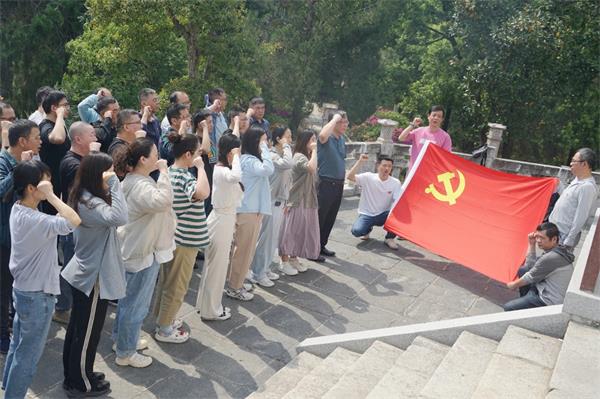 沿青石板拾級而上,在“革命烈士永垂不朽”的紀念碑前,大家駐足鞠躬、致敬先烈?!拔抑驹讣尤胫袊伯a黨……”面對鮮紅的黨旗,大家高舉右拳,重溫了入黨誓詞。